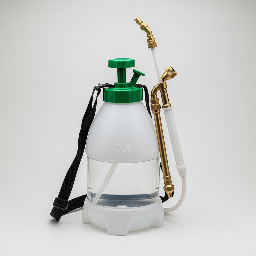 Compact 5-litre manual pressure sprayer for kitchen gardens, terrace gardens, and indoor plants. Adjustable brass nozzle for fine mist to direct jet spray. Lightweight and easy to carry — perfect for small-scale organic pest management.