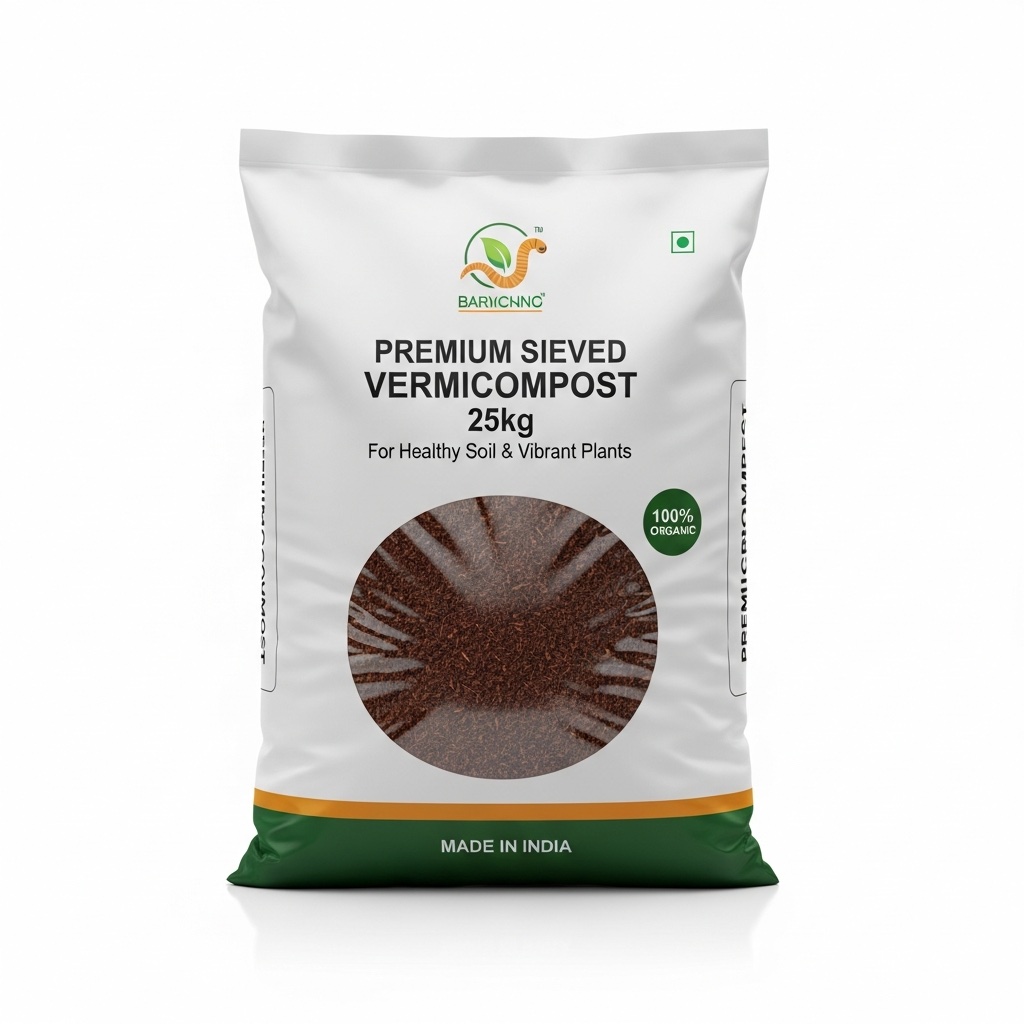 Premium sieved vermicompost produced from cow dung using Eisenia foetida earthworms. Enriches soil with beneficial microbes, improves water retention, and promotes healthy root growth. Ideal for vegetables, flowers, and fruit crops.