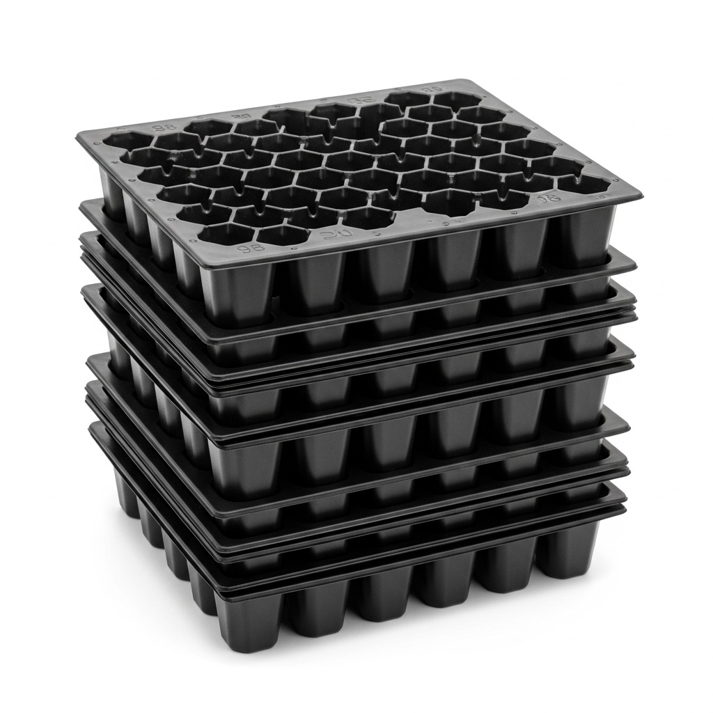 UV-stabilized 98-cell seedling trays for professional nursery raising. Perfect for tomato, chilli, brinjal, capsicum, and flower seedlings. Produces uniform plug seedlings with excellent root balls. Reusable for 4-5 seasons.