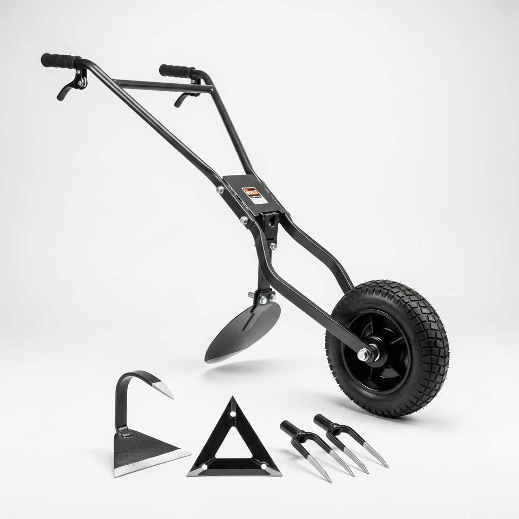 Manual push-pull wheel hoe for efficient inter-row weeding in vegetable fields. Comes with 3 interchangeable blade attachments for weeding, shallow cultivation, and soil loosening. Saves 70% labor compared to hand weeding.